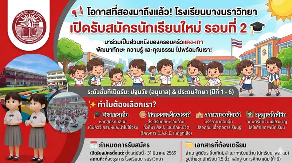 โรงเรียนบางนราวิทยาเปิดรับสมัครรอบที่ 2 ที่นั่งใกล้เต็มแล้ว!
