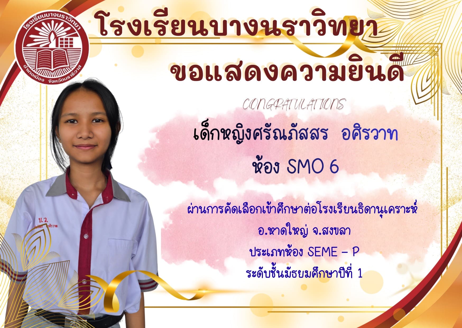 เด็กหญิงศรัณภัสสร อศิรวาท ห้อง SMO 6 ที่สามารถสอบผ่านการคัดเลือกเข้าเรียนต่อ ม.1 ได้ที่ โรงเรียนธิดานุเคราะห์ จ.สงขลา ในหลักสูตร SEME - P ได้สำเร็จ