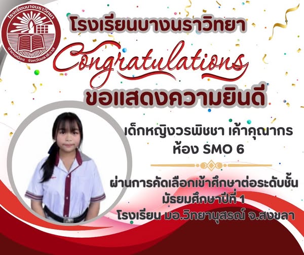 โรงเรียนบางนราวิทยา ขอแสดงความยินดีกับ "เด็กหญิงวรพิชชา เค้าคุณากร" ห้อง SMO 6 ที่สามารถสอบผ่านการคัดเลือกเข้าศึกษาต่อ ม.1 ได้ที่ โรงเรียน มอ.วิทยานุสรณ์ จ.สงขลา