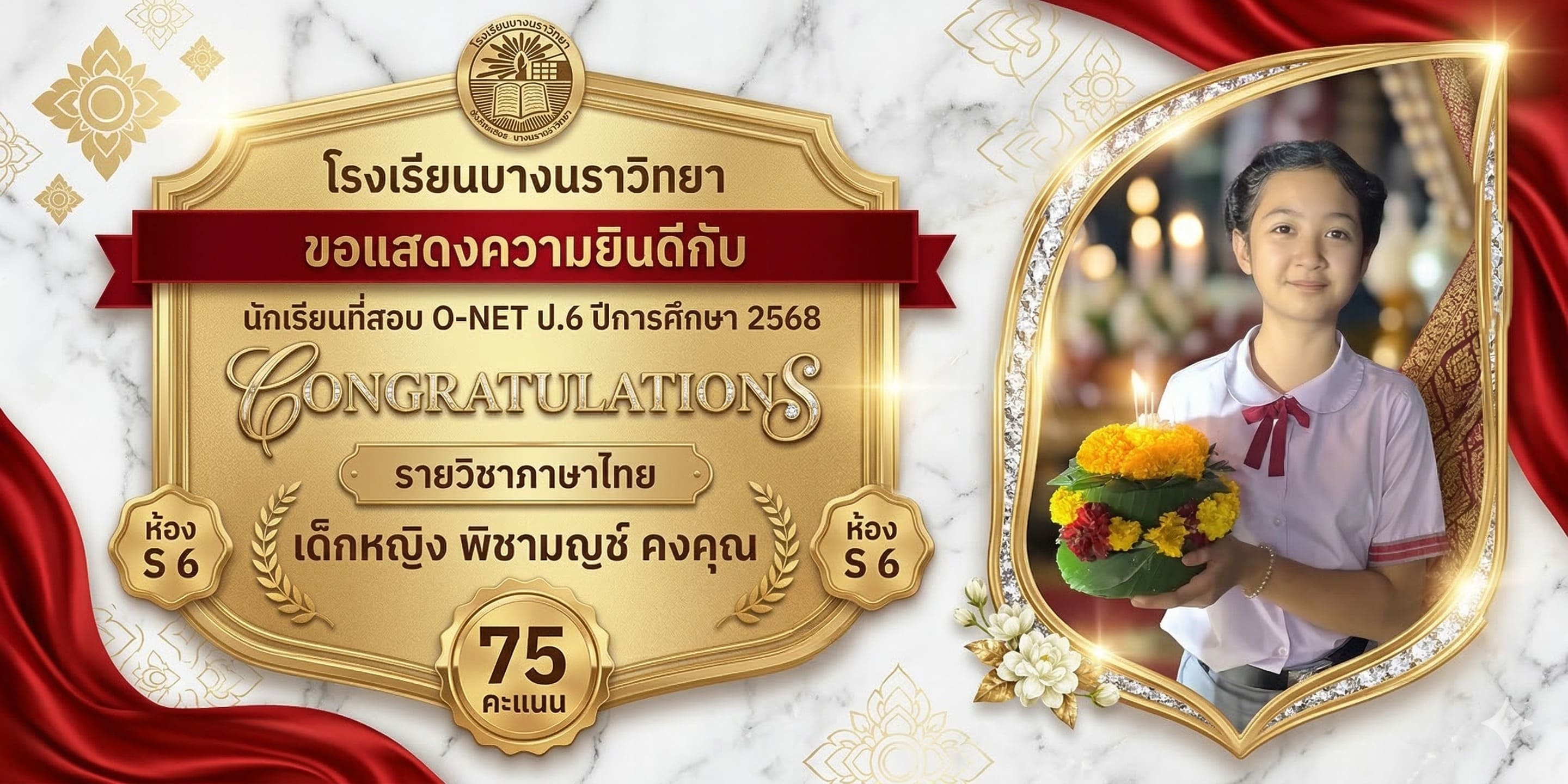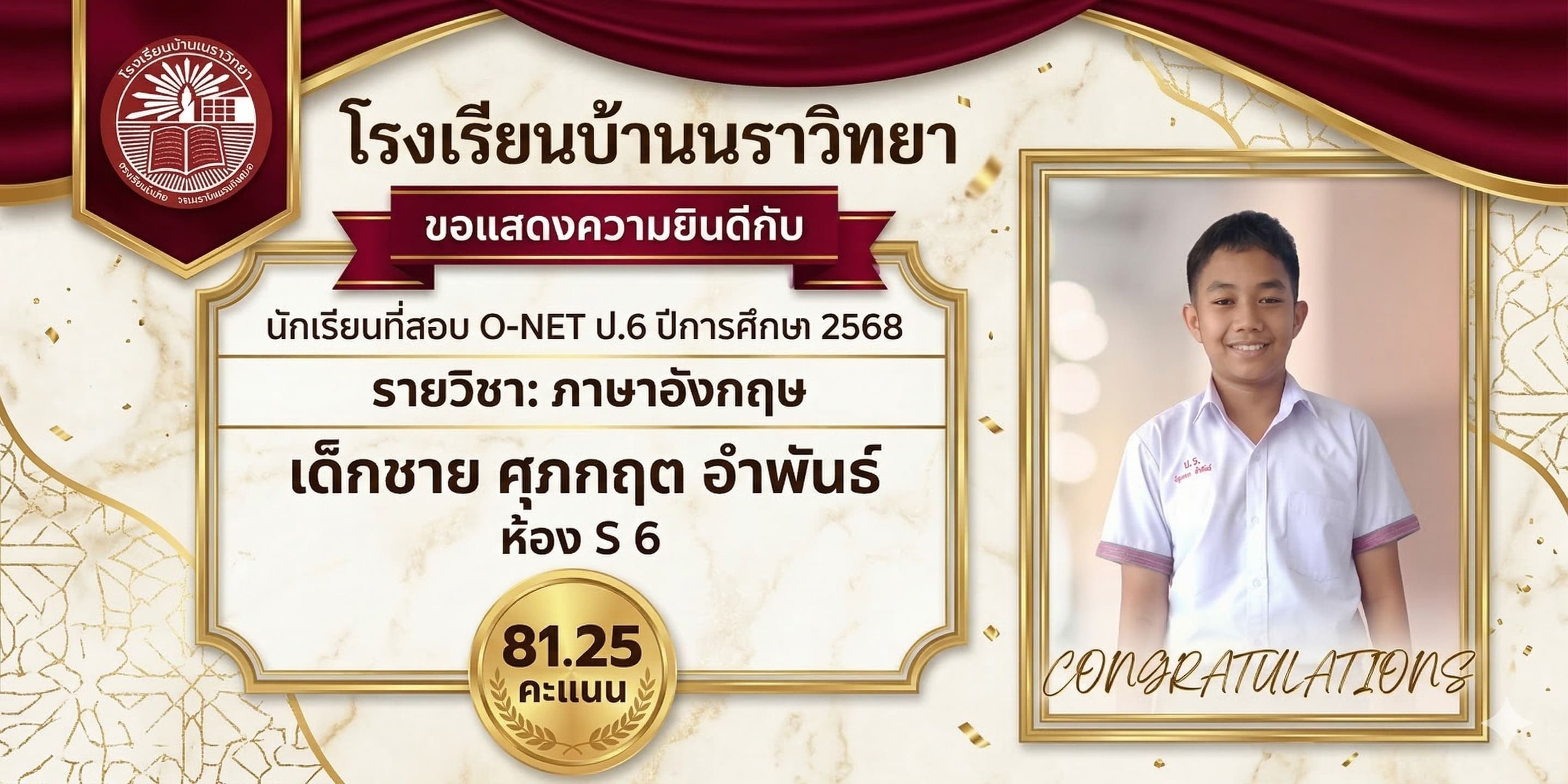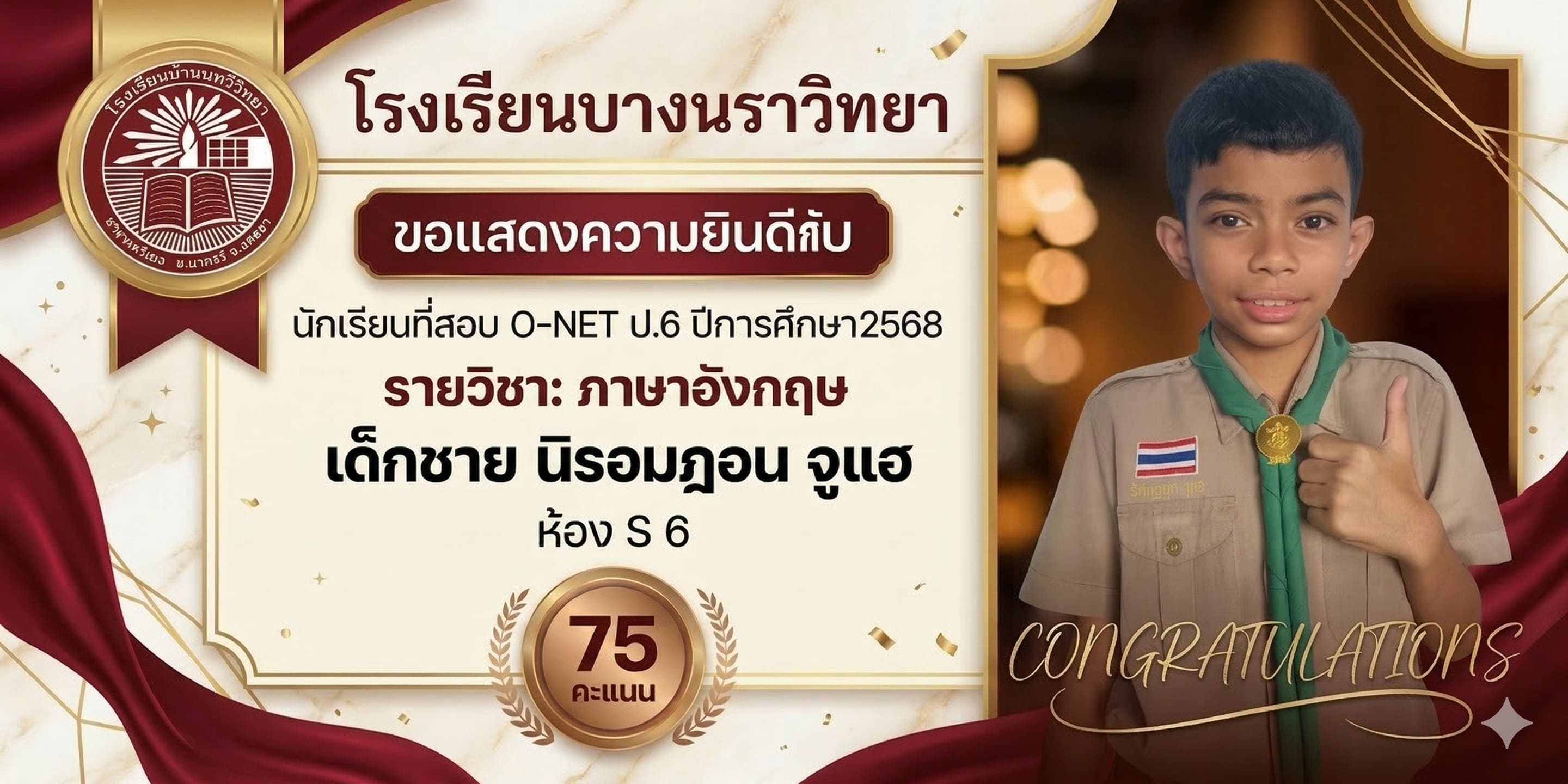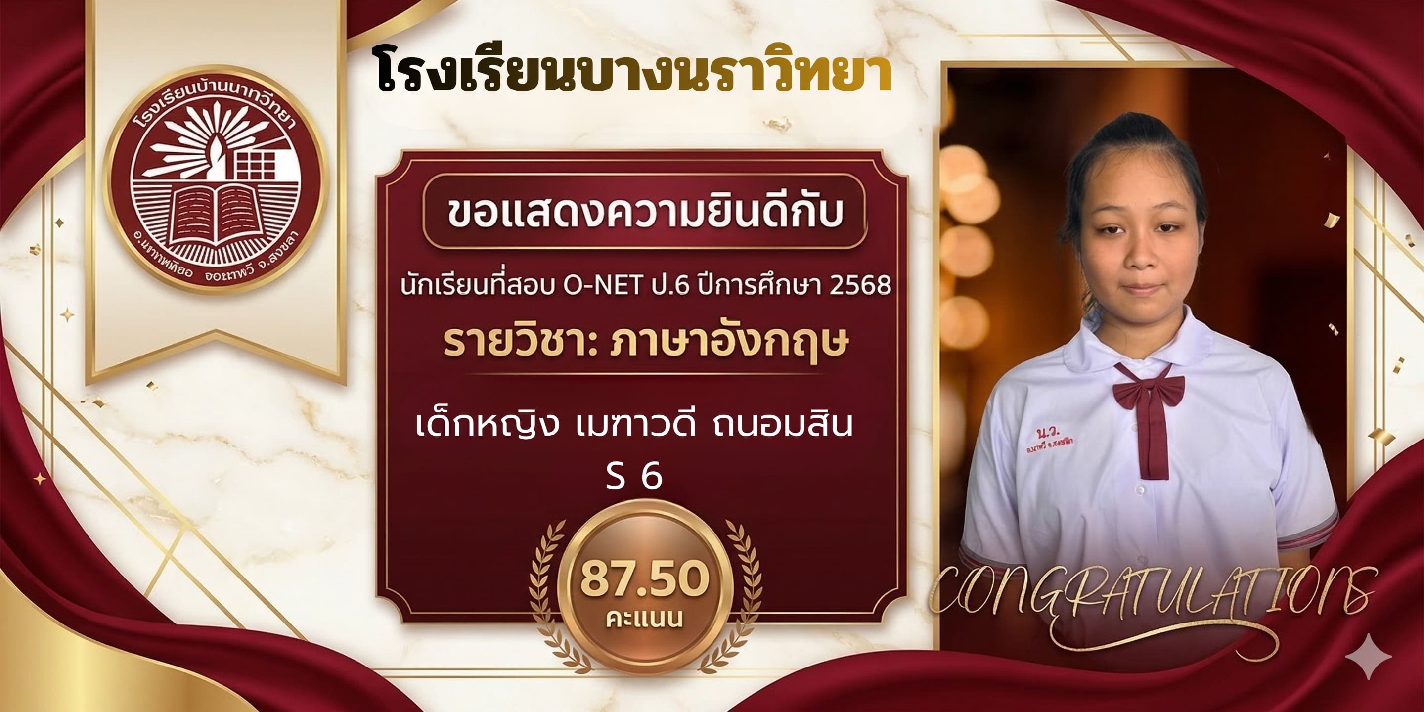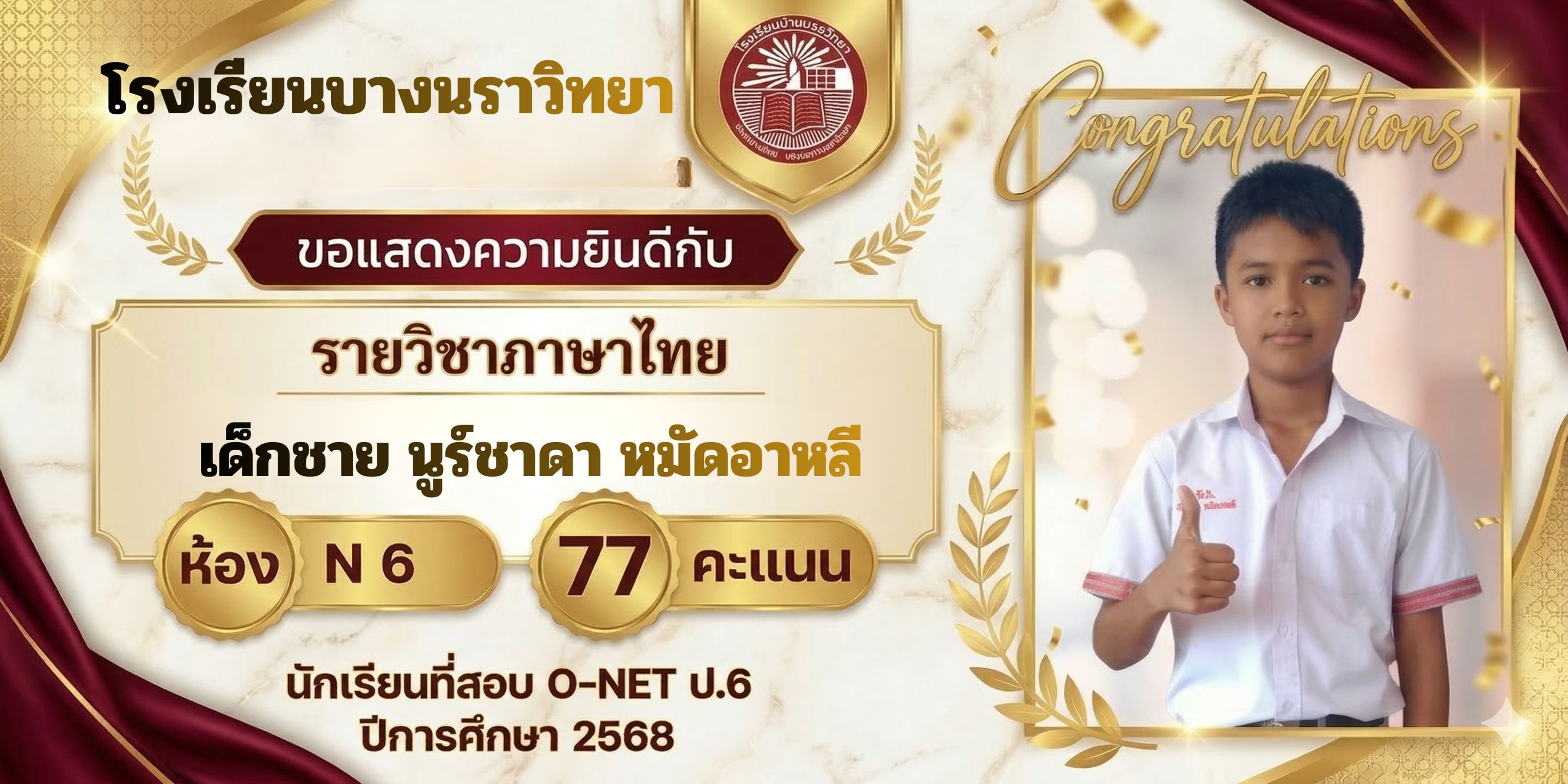 โรงเรียนบางนราวิทยา ขอแสดงความชื่นชมและยินดีกับความสำเร็จของนักเรียนทุกคน ที่มีความมุ่งมั่น ตั้งใจ และทุ่มเทในการสอบ O-NET ประจำปีการศึกษา 2568