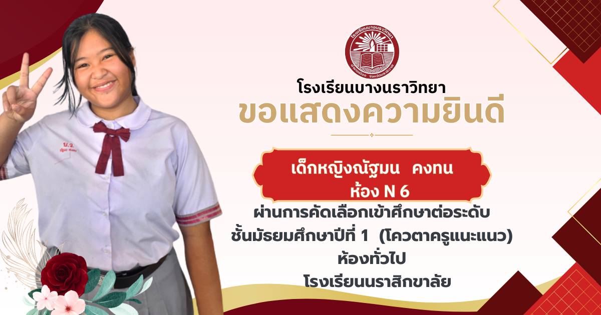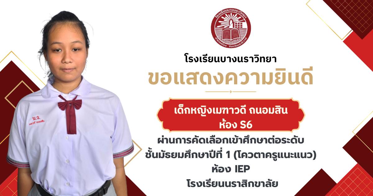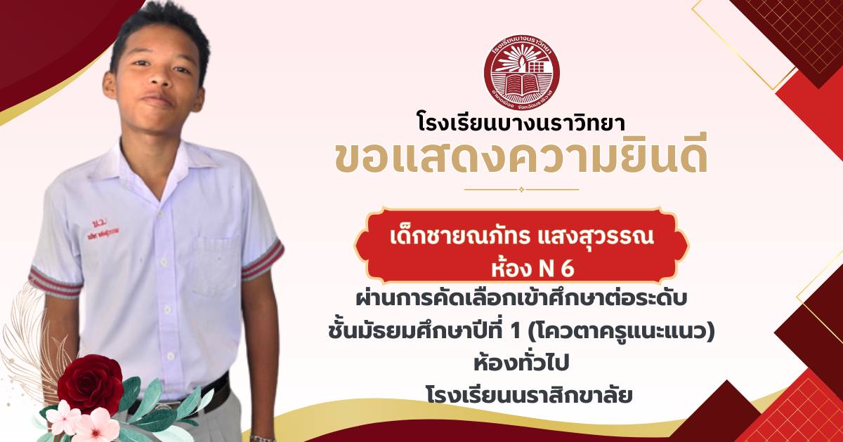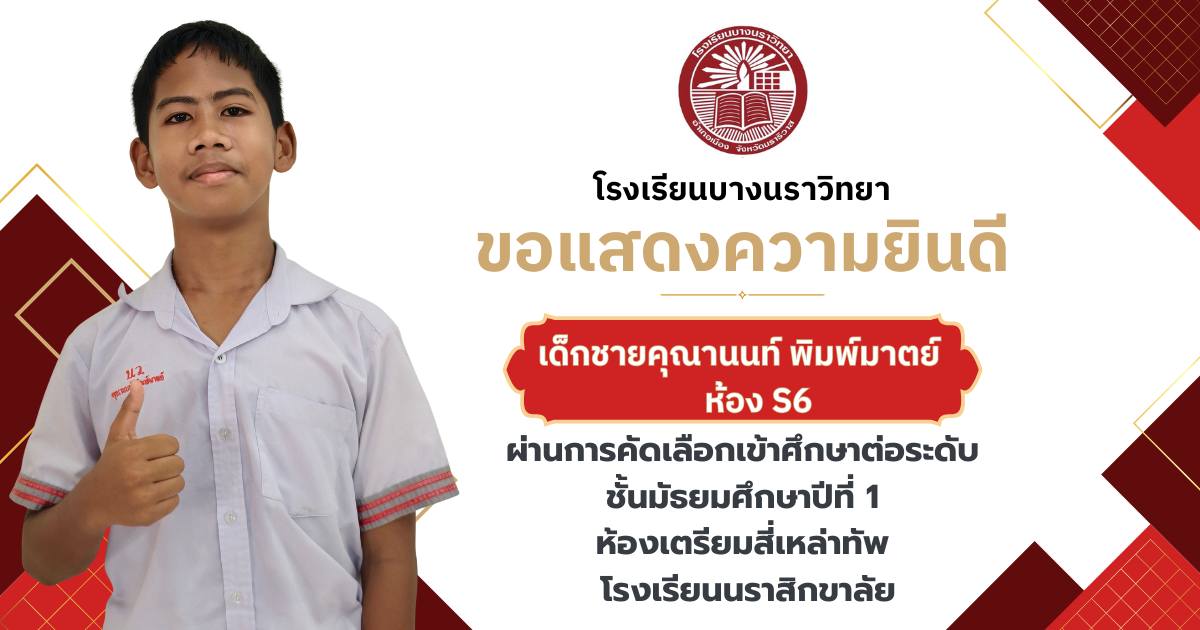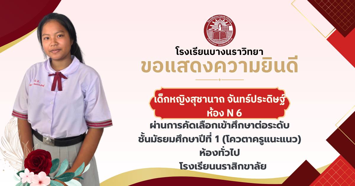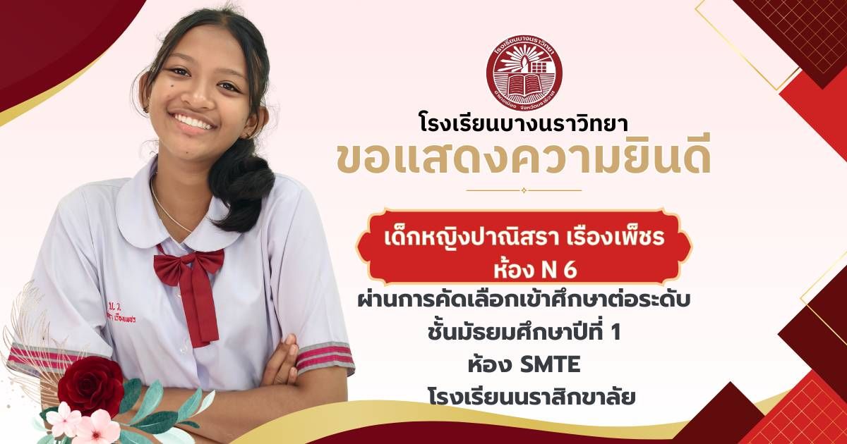 โรงเรียนบางนราวิทยา ขอแสดงความยินดีกับนักเรียนชั้นประถมศึกษาปีที่ 6 ทุกคน ในโอกาสที่สามารถผ่านการคัดเลือกและเข้าศึกษาต่อในระดับชั้นมัธยมศึกษาปีที่ 1 ณ โรงเรียนต่างๆ ประจำปีการศึกษา 2569