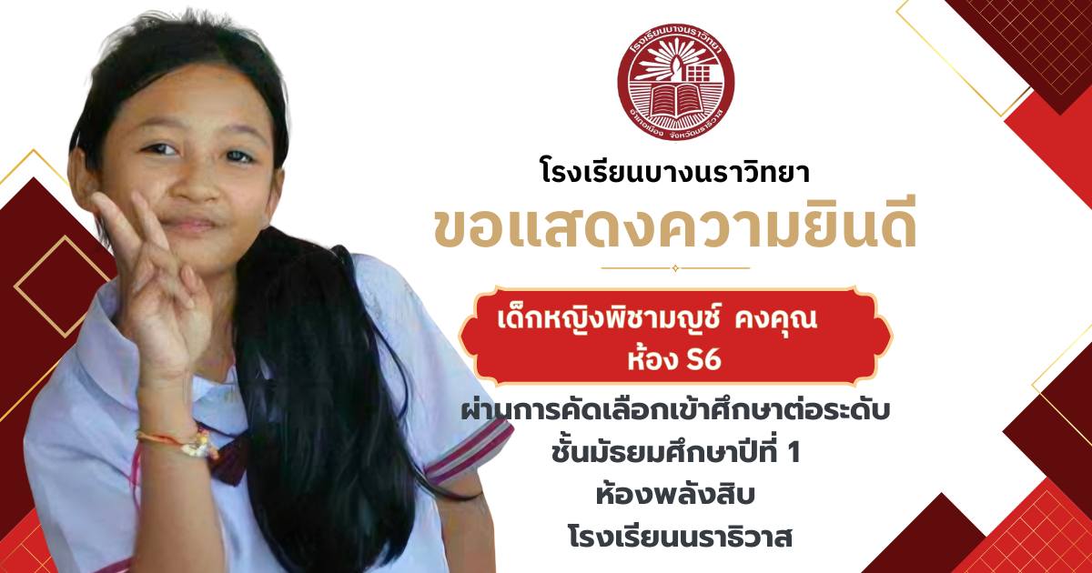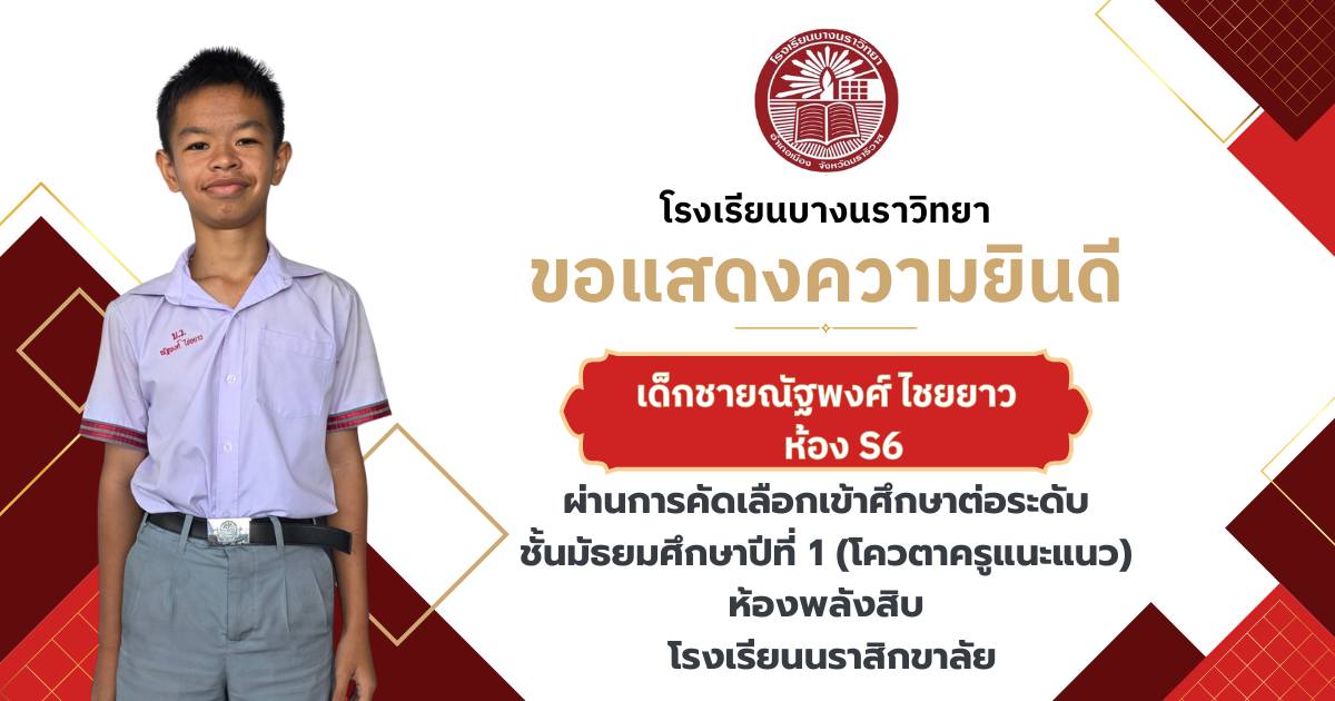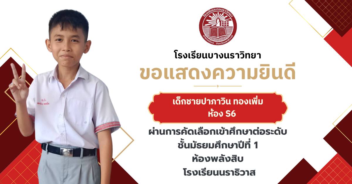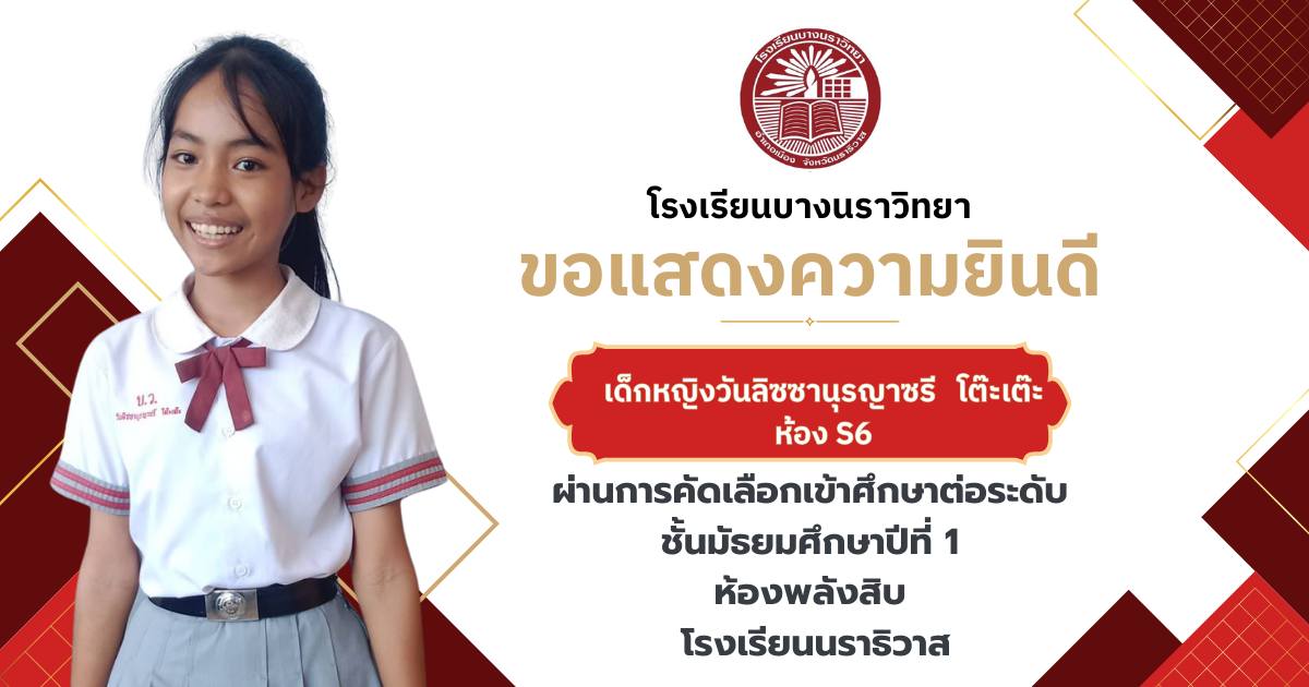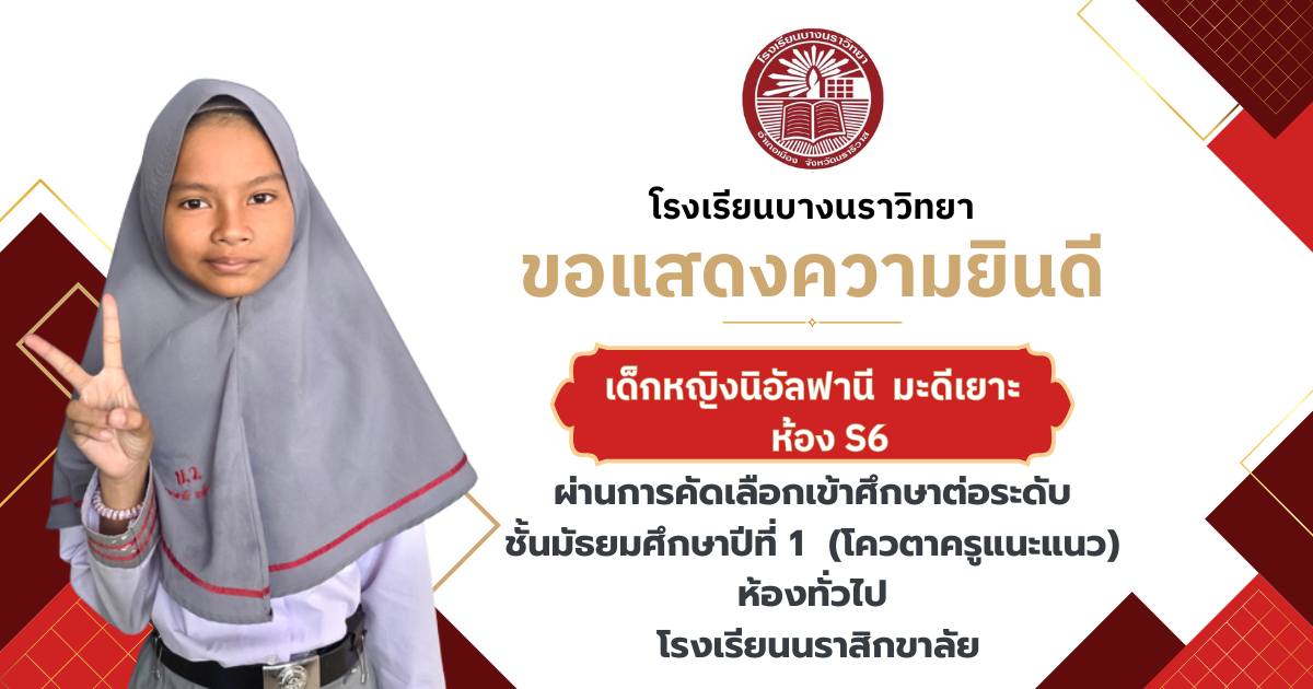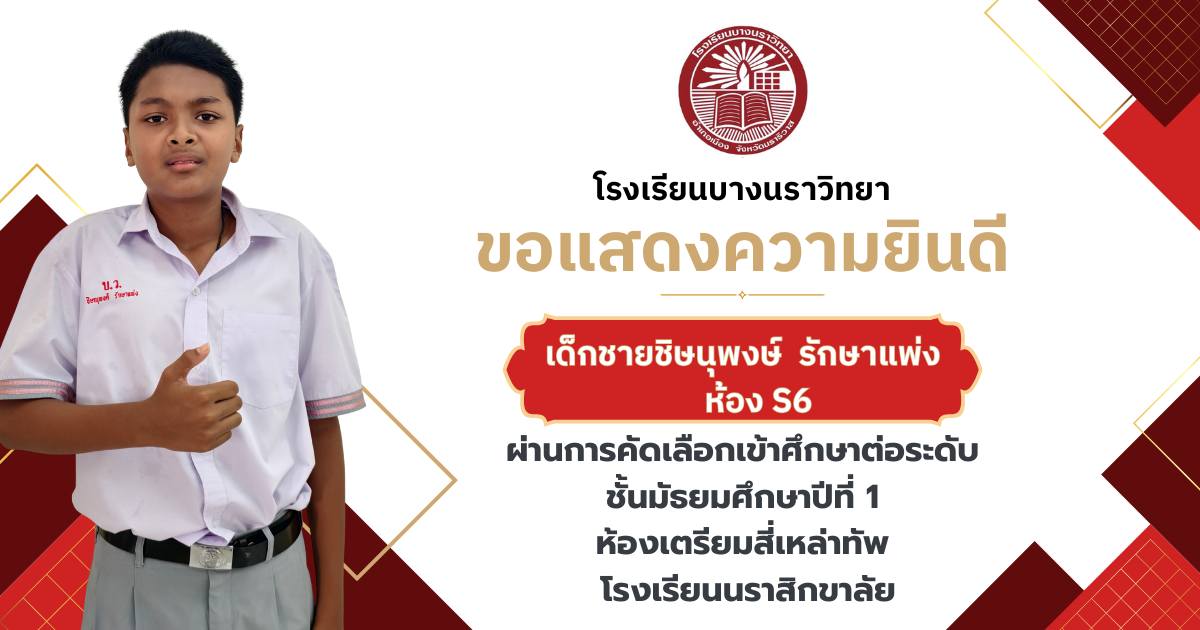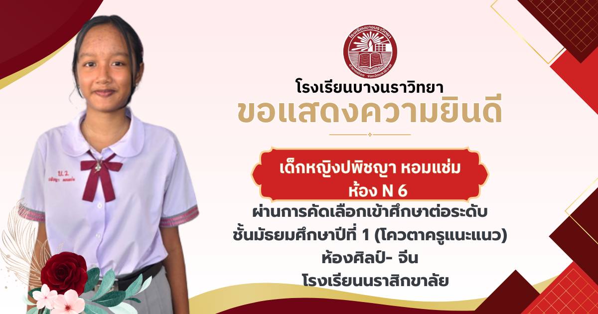 โรงเรียนบางนราวิทยา ขอแสดงความยินดีกับนักเรียนชั้นประถมศึกษาปีที่ 6 ทุกคน ในโอกาสที่สามารถผ่านการคัดเลือกและเข้าศึกษาต่อในระดับชั้นมัธยมศึกษาปีที่ 1 ณ โรงเรียนต่างๆ ประจำปีการศึกษา 2569