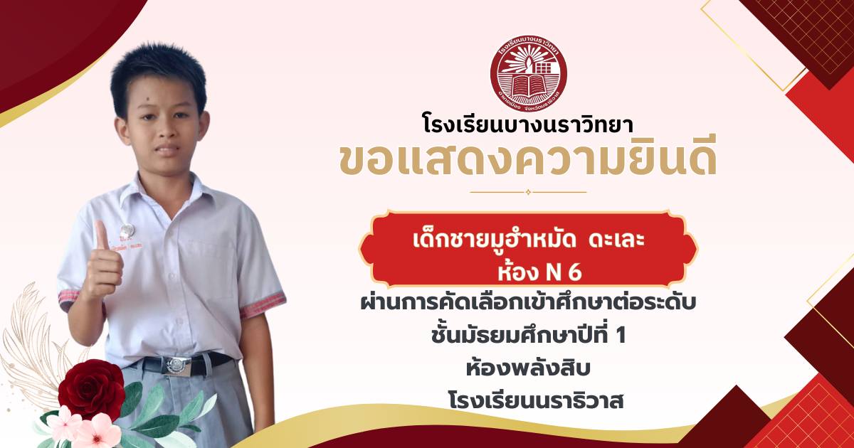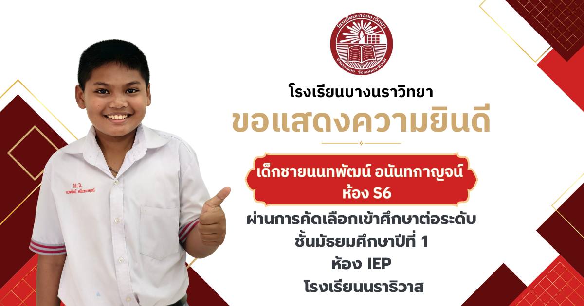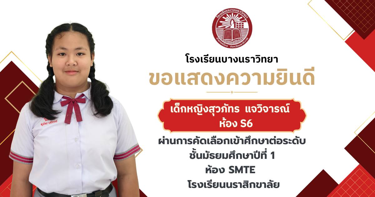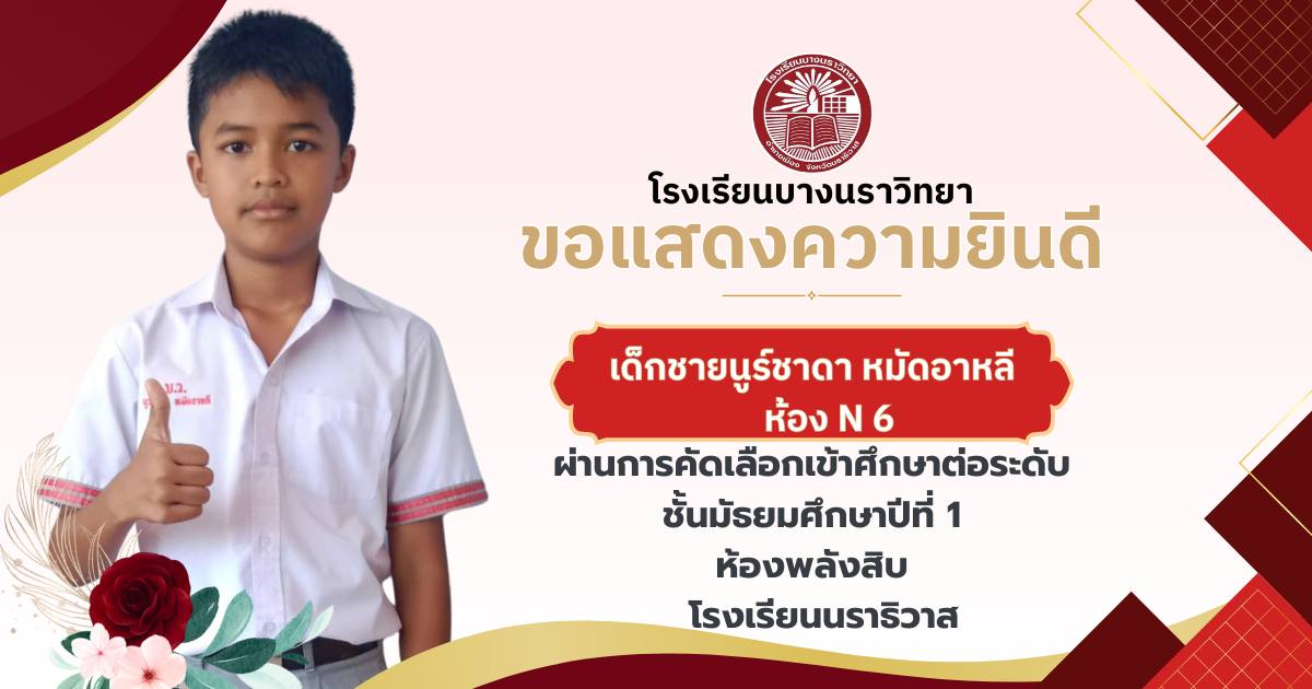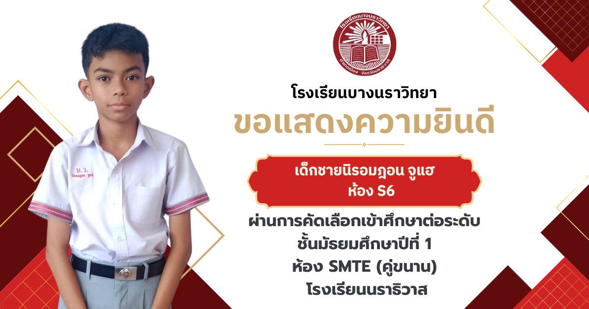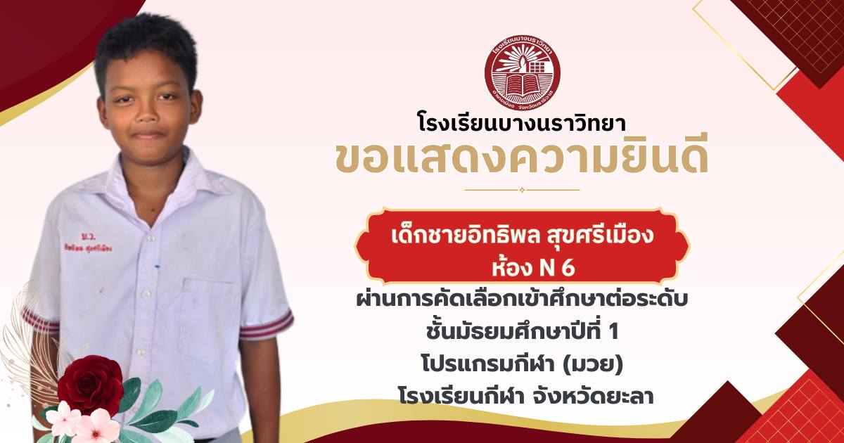 โรงเรียนบางนราวิทยา ขอแสดงความยินดีกับนักเรียนชั้นประถมศึกษาปีที่ 6 ทุกคน ในโอกาสที่สามารถผ่านการคัดเลือกและเข้าศึกษาต่อในระดับชั้นมัธยมศึกษาปีที่ 1 ณ โรงเรียนต่างๆ ประจำปีการศึกษา 2569