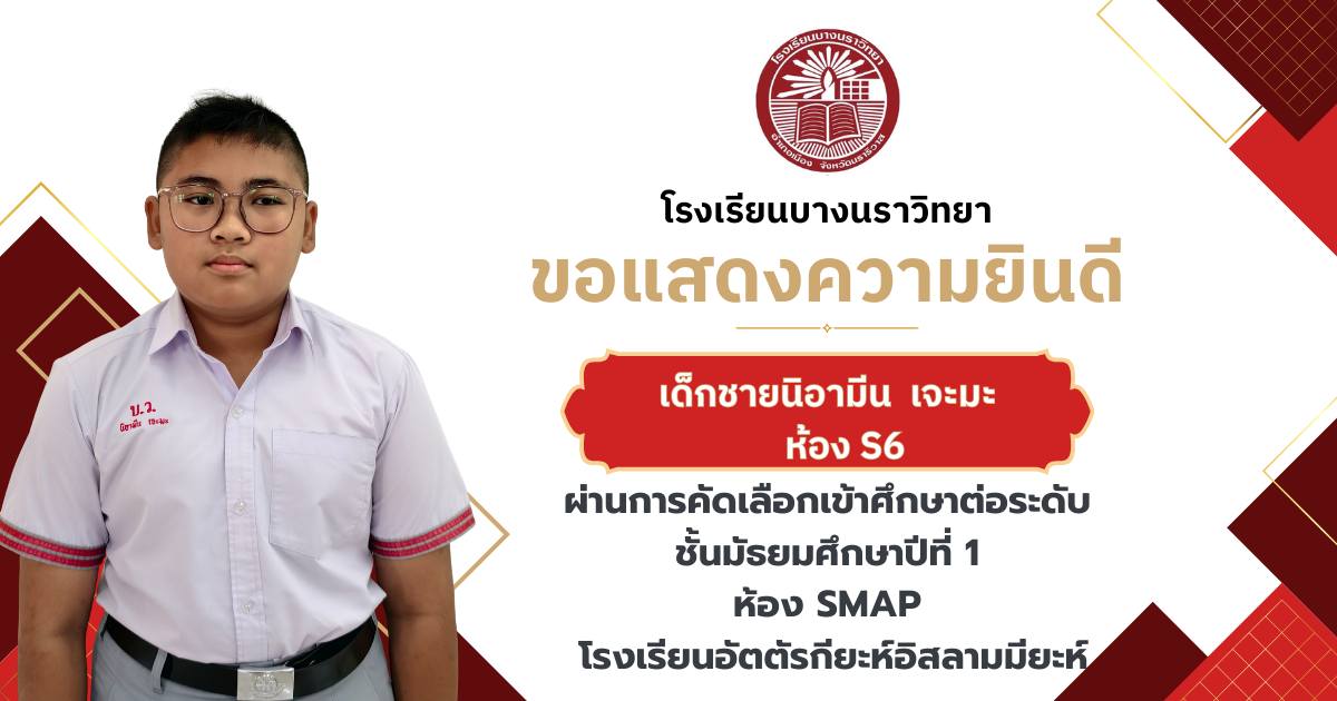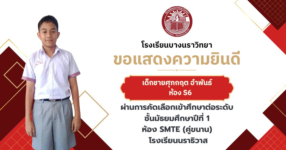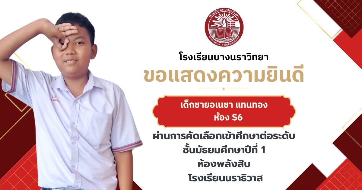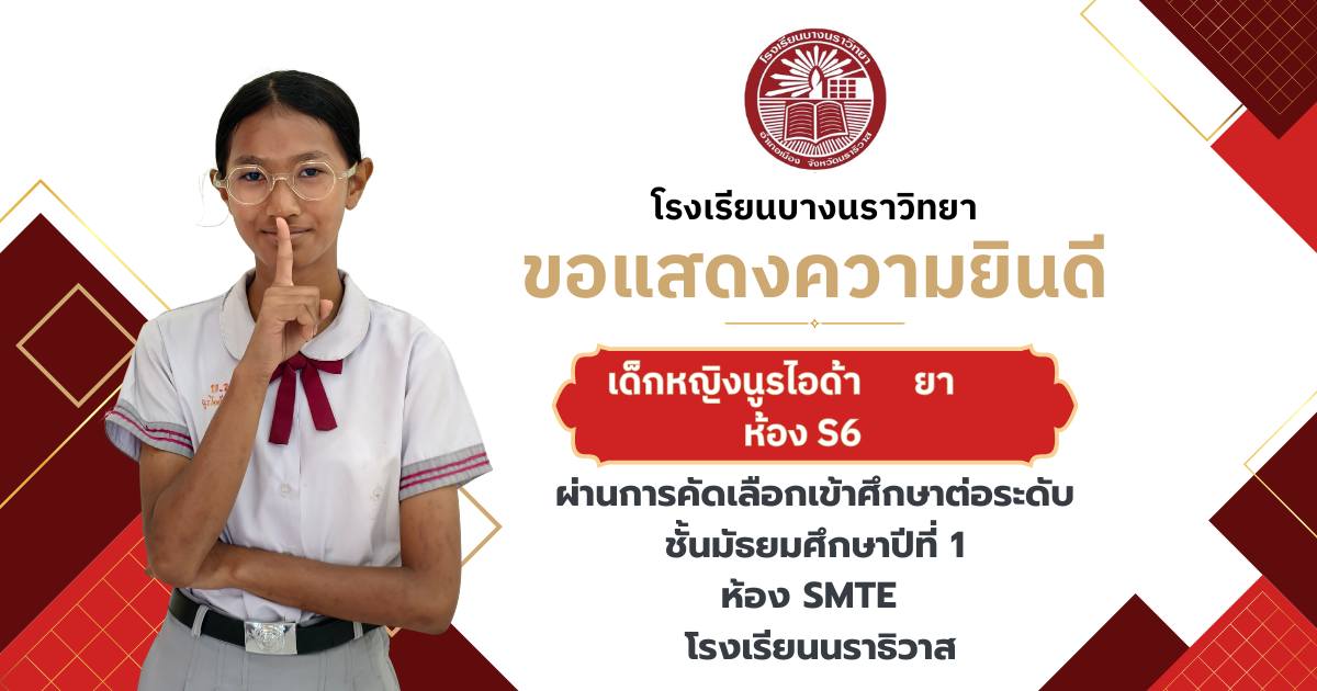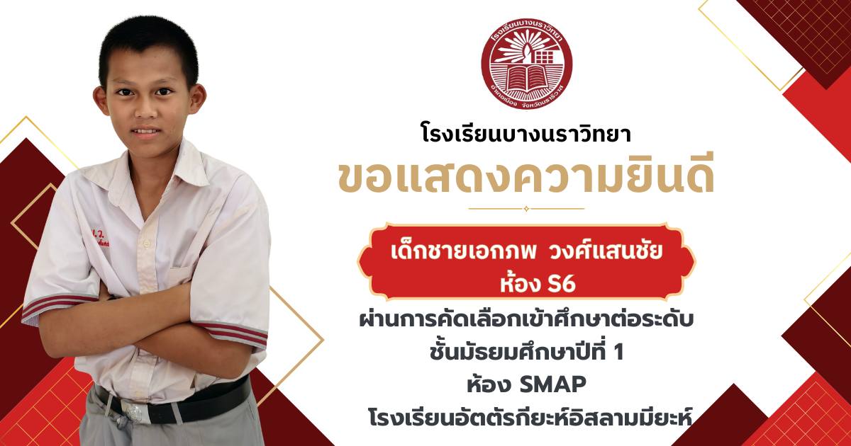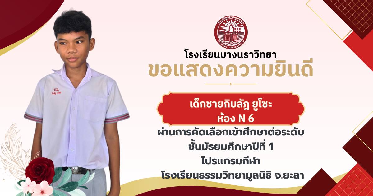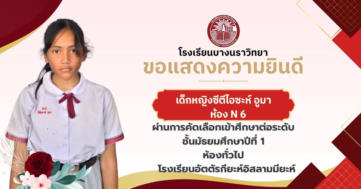 โรงเรียนบางนราวิทยา ขอแสดงความยินดีกับนักเรียนชั้นประถมศึกษาปีที่ 6 ทุกคน ในโอกาสที่สามารถผ่านการคัดเลือกและเข้าศึกษาต่อในระดับชั้นมัธยมศึกษาปีที่ 1 ณ โรงเรียนต่างๆ ประจำปีการศึกษา 2569