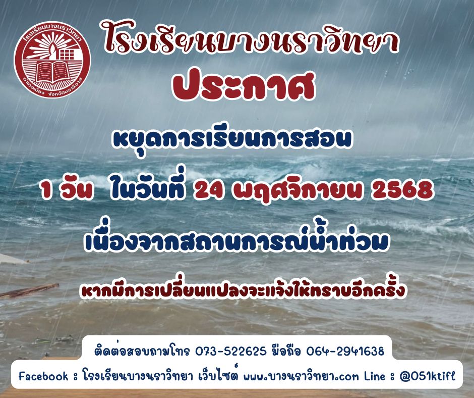 ทางโรงเรียนบางนราวิทยา ขอแจ้งประกาศ หยุดการเรียนการสอน เป็นเวลา 1 วัน