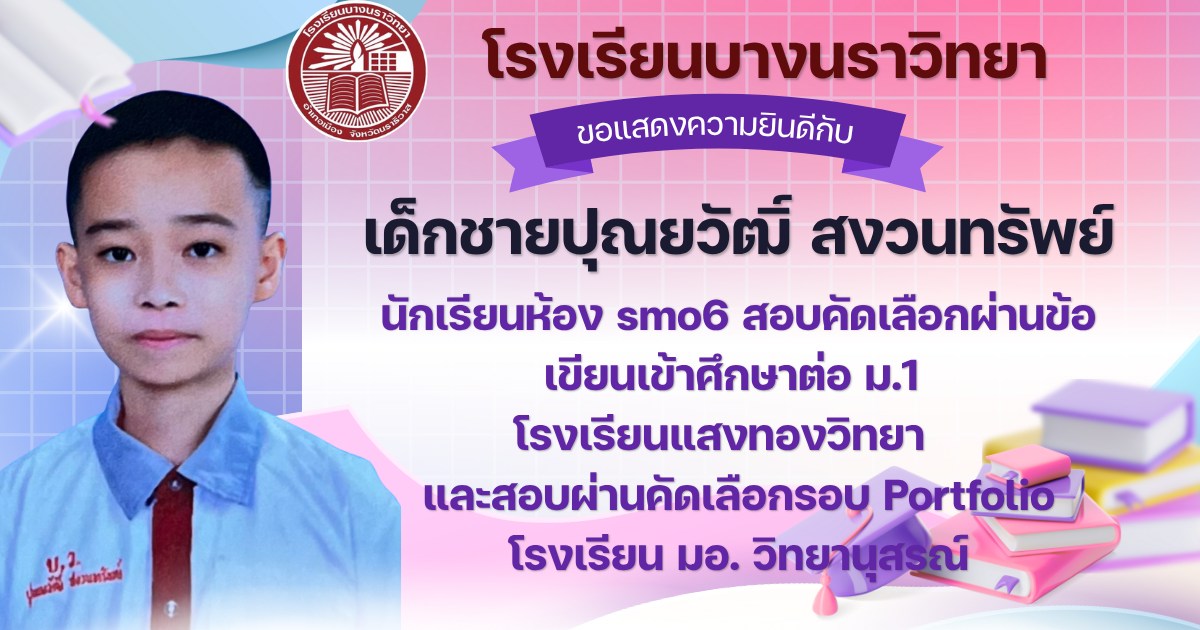 โรงเรียนบางนราวิทยา ขอแสดงความชื่นชมและยินดีกับ เด็กชายปุณยวัฒิ์ สงวนทรัพย์ นักเรียนชั้น SMO6 ที่ได้แสดงความสามารถและความมุ่งมั่นตั้งใจ จนผ่านการคัดเลือกเข้าศึกษาต่อในระดับชั้นมัธยมศึกษาปีที่ 1 ได้ถึง 2 สถาบันชั้นนำ ได้แก่: